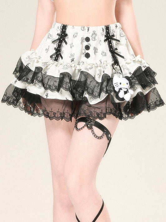 Bowknot Details Lace Glamorous And Skirt Cross Print Gray Trim Tiered Kitty