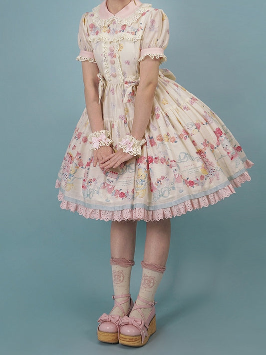 Bow Sweet Lolita Dress Flutter Pink Lace-up Bodice High Waist Sleeves with Big Jumper Skirt Detachable
