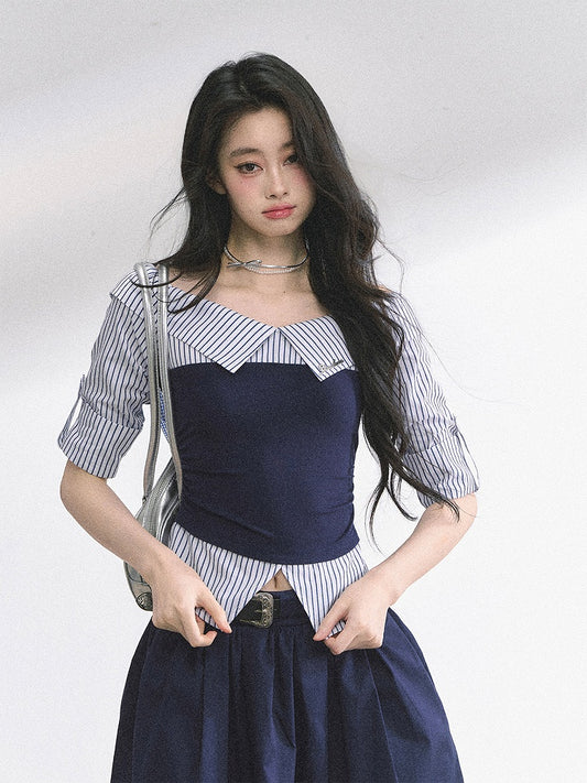 Blue Shirt Striped Foldover Collar Gray/Navy Neckline Off-the-shoulder