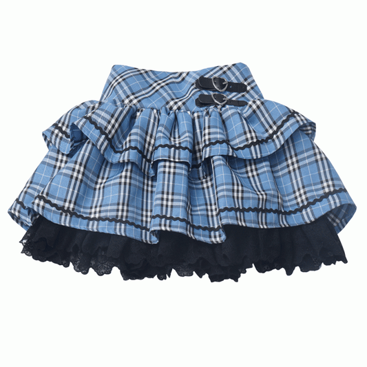 Blue Heart Black Plaid Pattern and Tiered Skirt Buckles Lace Trim Idol