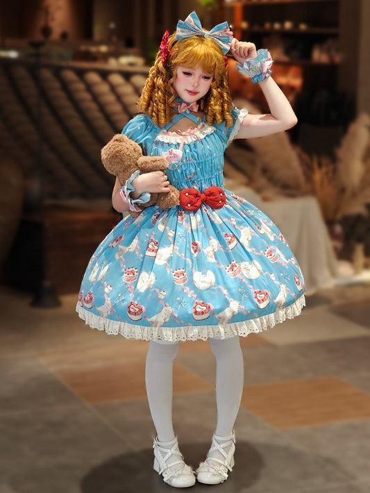 Blue Lolita Dress Bell Cake Piece Long Strawberry Sleeves One Sweet Print