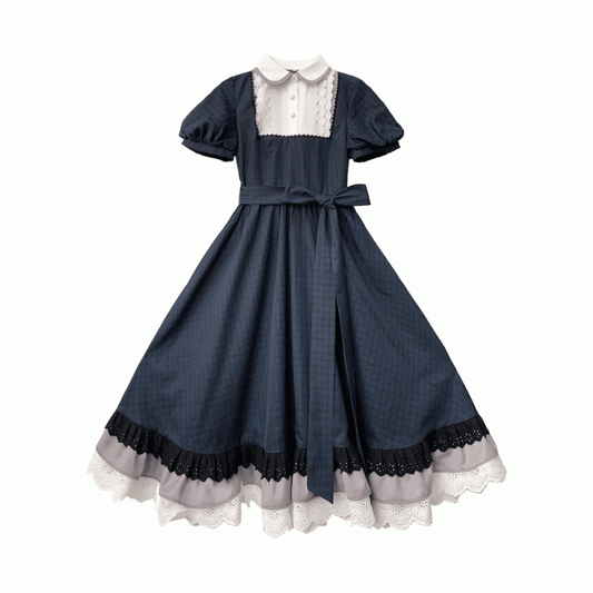 Blue Navy Piece Peter Pan Collar and Puff Sleeves Pattern Classic Plaid Lolita One with Elegant in