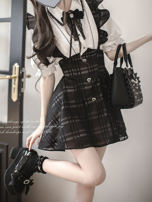 Blouse with Sweetheart Lace Jirai Puff Rhinestone Black Kei White Trim Sleeve Buttons