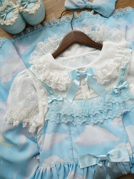 Blue and White Old School Lolita Fashion Dress Bowknot Detais JSK Set