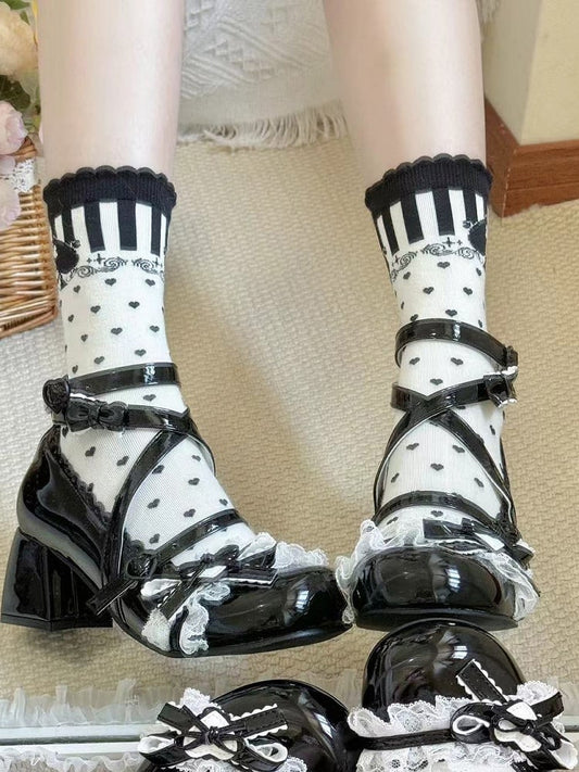 Block Leather PU Sweet for High Black Janes Transparent - Heart Lolita Decor Mary Rose Heel