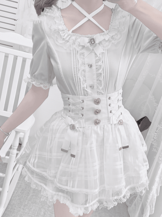 Blouse Halter White Jirai Rhinestones Details Heart-Shaped and Pleating Kei with Criss-cross
