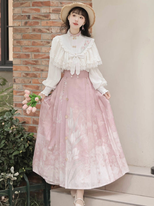 Blouse Pleated Shawl Ribbon Skirt China + Sweet Lace Floral