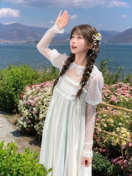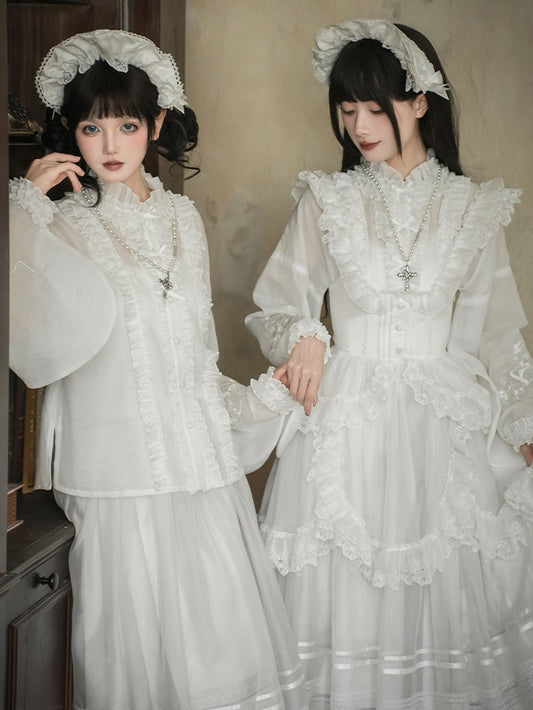 Blouse Han Sleeves Floral Neckline Embroidery White Snake and Lolita Long Ruffle