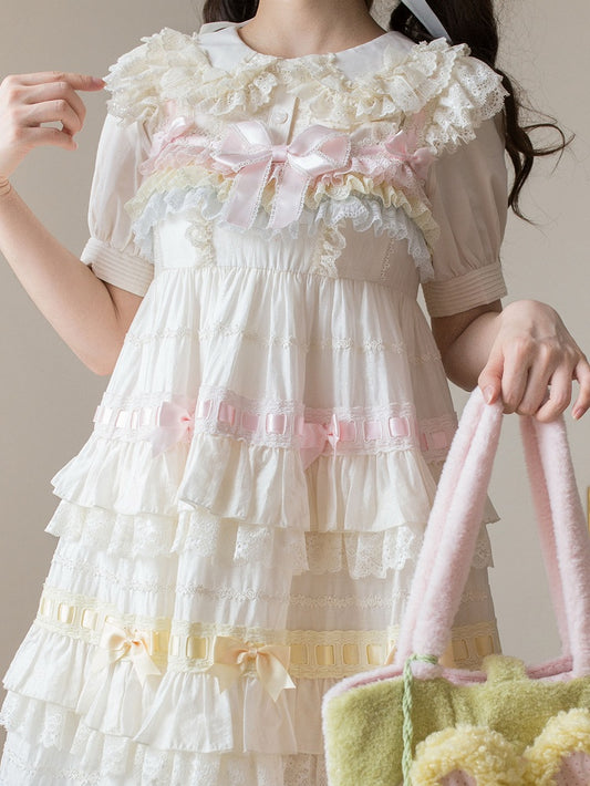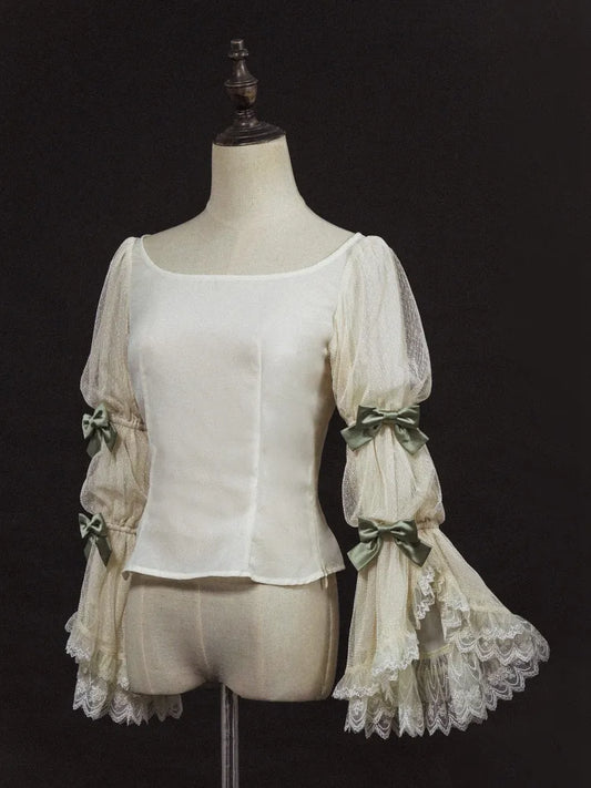 Blouse / Short Pink Sleeves Puff Bows Lolita Decorated White