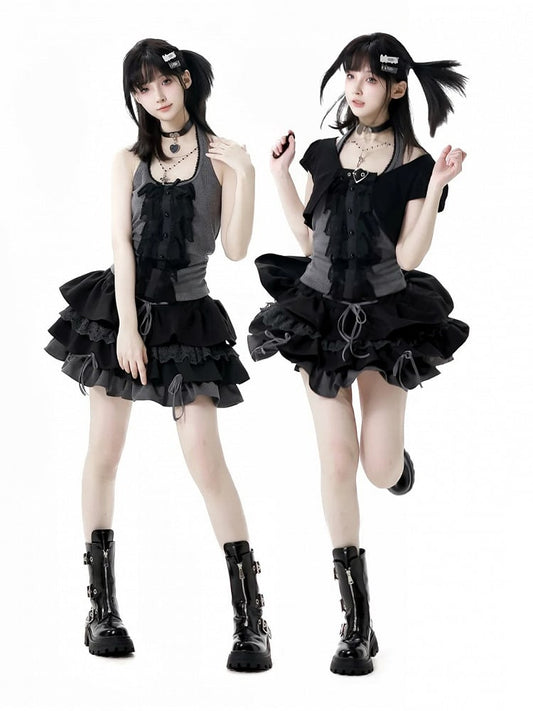 Black and Gray Glamorous Tiered Skirt with Lace-up Detail