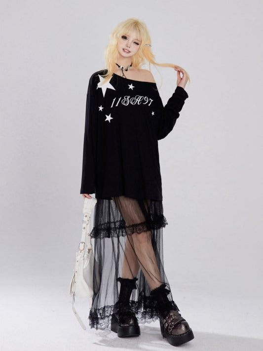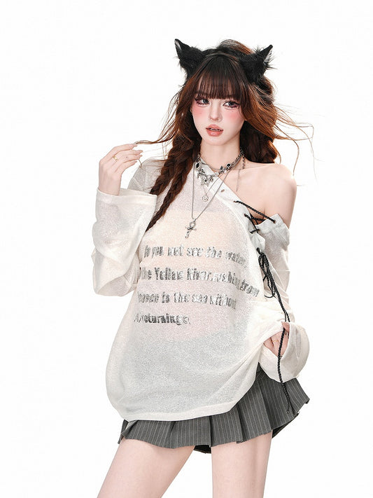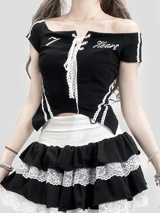 Black Bittersweet Neckline Top With Lace-Up Detail And Letter Print Off-the-shoulder Kawaii