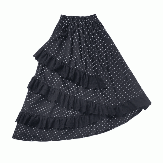 Black Elastic Waist Asymmetrical Lace Polka-Dot Skirt Trim