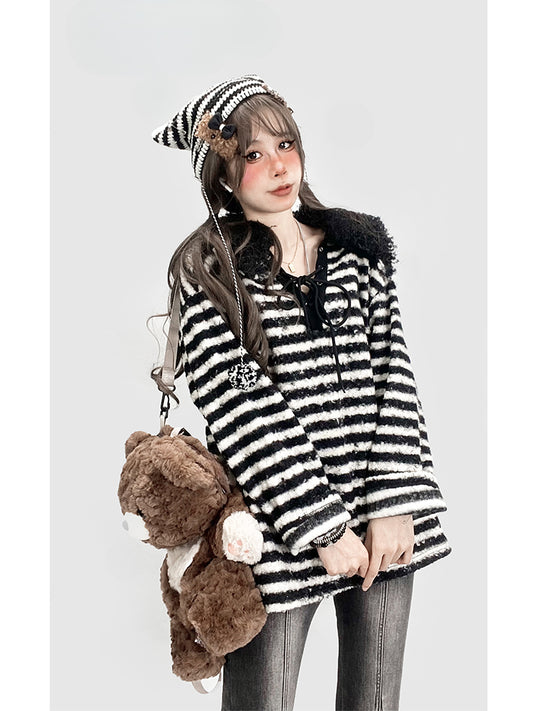 Black&White Striped Pattern V-neck Oversize Knitted Sweat Shirt with Detachable Collar