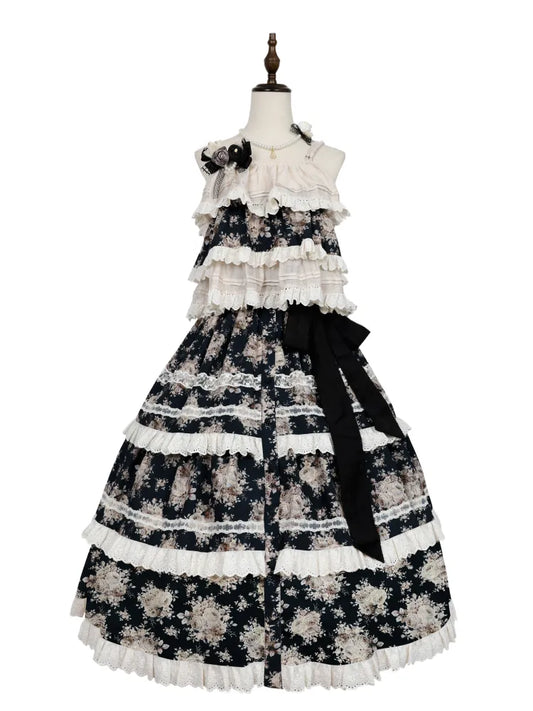 Black Ruffle Sweet Lolita Buttons with Overall Dress Layered Double-Breasted