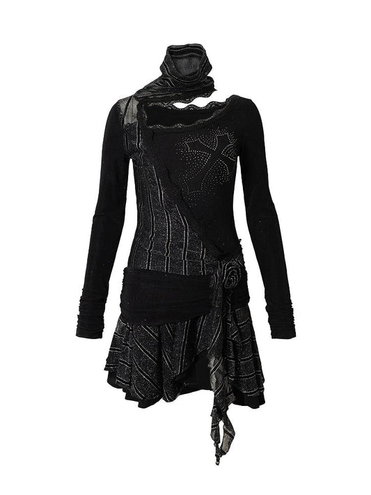 Black Ruched Rhinestone Asymmetrical Blend Cross with Dress Neck Hem
