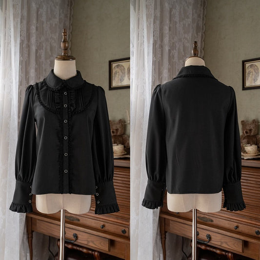 Black Ruffle Neckline Leg-of-Mutton Sleeves Blouse