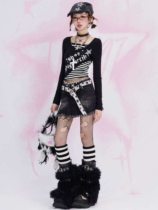 Black Letters Print Fake Two-piece Striped Long Sleeves Top