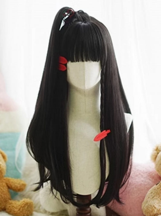 Black Long Straight Wig With Bangs+Double Ponytail Claw Clips