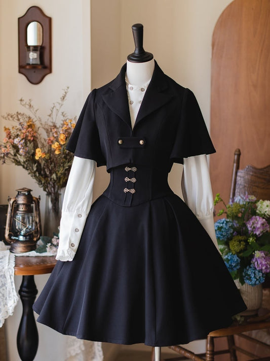 Black Long Version Boned Waist Square Neckline Dress Elegant Lolita Full Set
