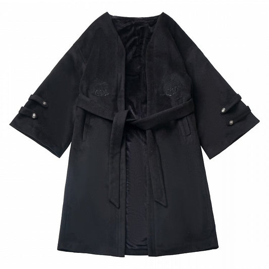 Black Open Placket Cherry Tonal Embroidery Coat with Selt-tie Belt