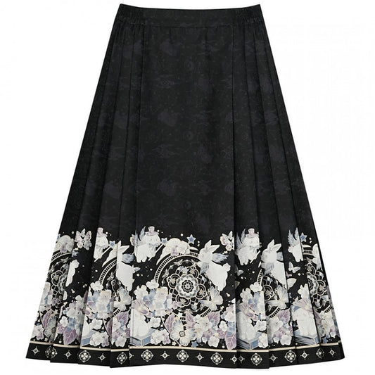 Black Moon Rabbit Cheongsam Style Pleated Midi Skirt