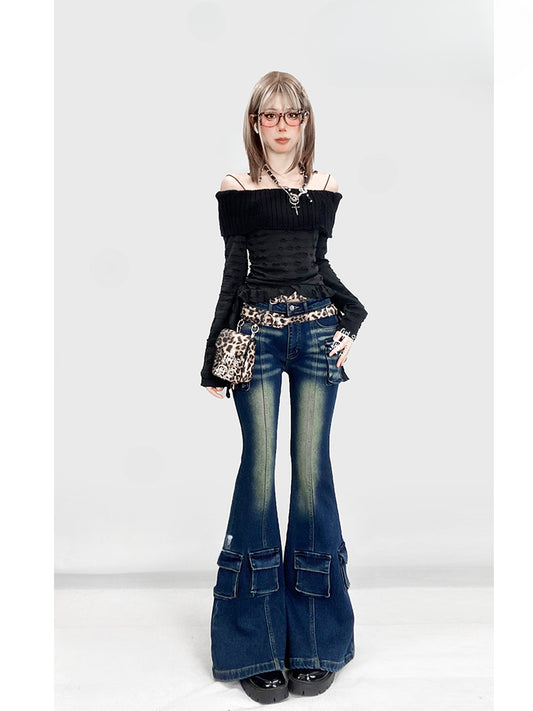 Black Low-Waist Slim-fitting Flared Cargo Pants