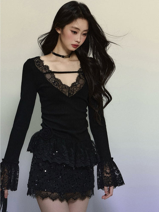 Black Lace Trim V-neck Knit Top