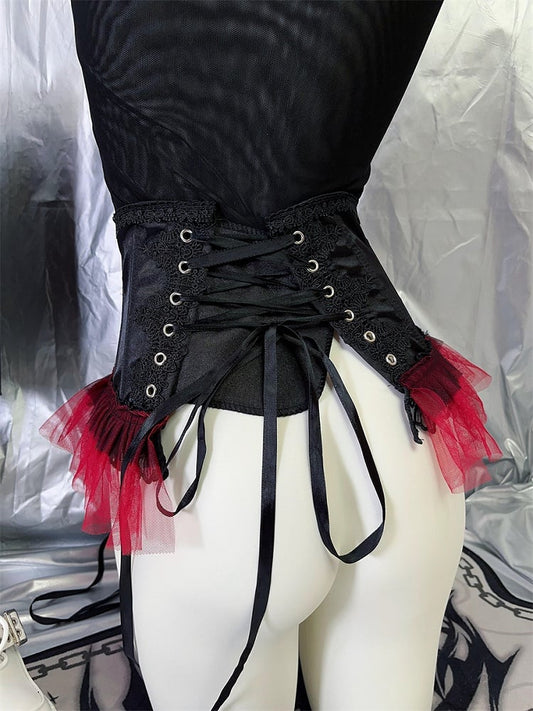 Black Red Lace Trim Goth Corset Belt with Beaded Chains