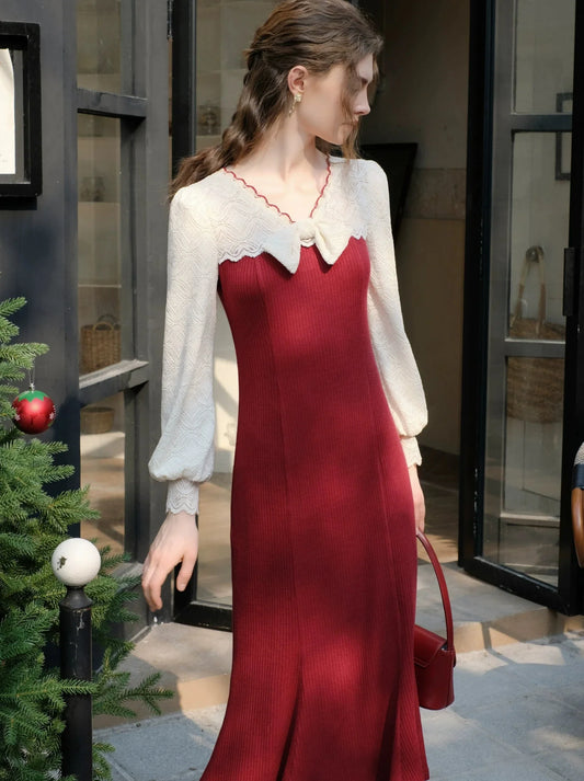 French Mermaid Ribbon Liqueur Lace Knit Dress Cherry