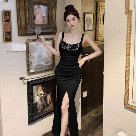 Sleeveless Square Neck Sequin Ruched Slit Panel Maxi Sheath Dress