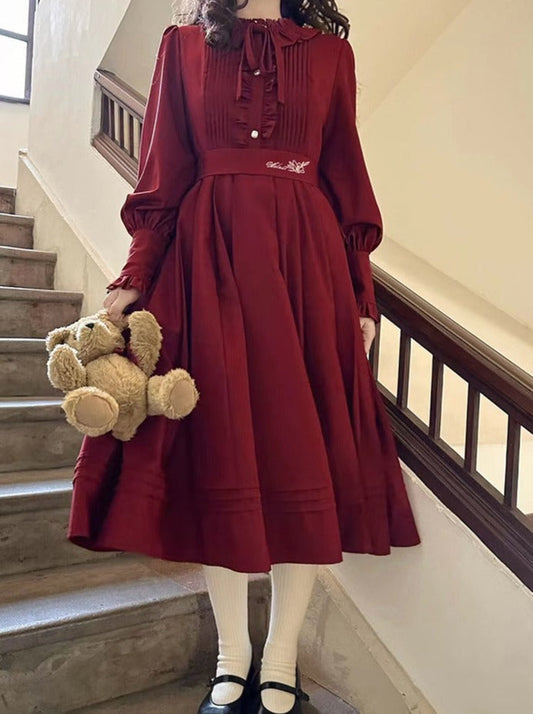 Red and Accents Lace Ruffles with Dress Lolita White Sweet Bow Layered