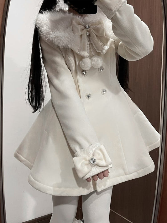Jirai Kei Beige Detachable Plush Collar and Cuffs Landmine Style Woolen Coat with Bow