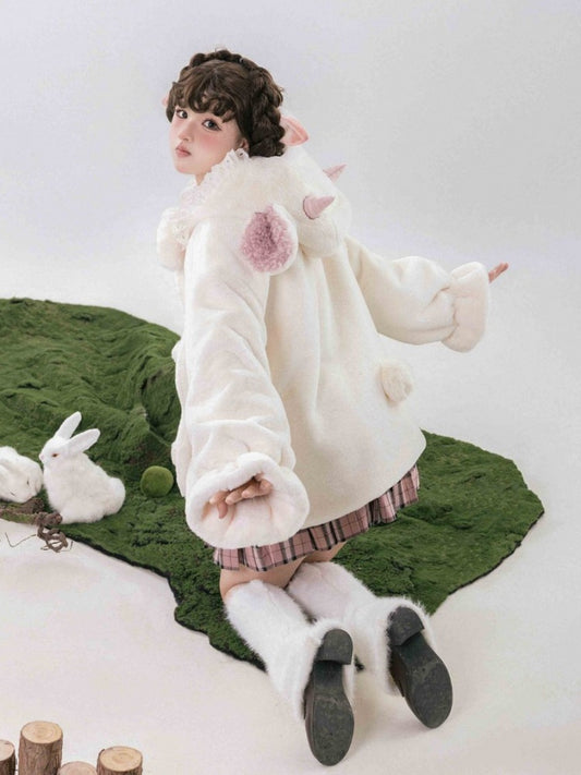 White Cute Lamb Ears Hooded Winter Cozy Plush Coat