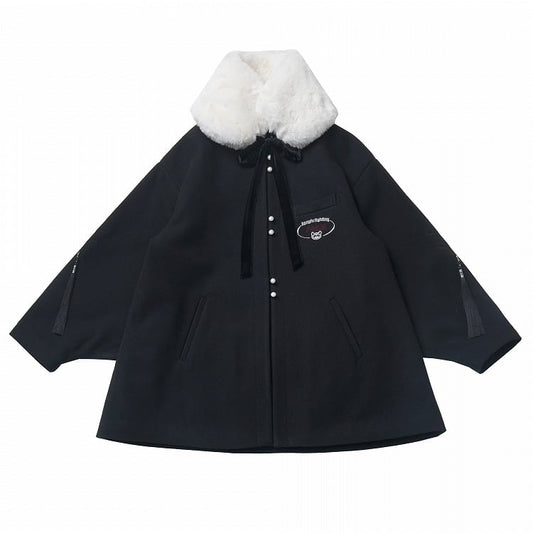 Jirai Kei Black Detachable Plush Collar and Cuffs Landmine Style Woolen Coat with Bow