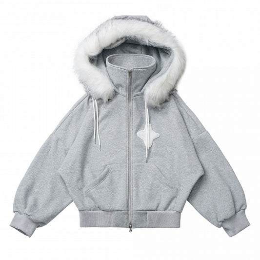 Faux Fur Collar Star Applique Grey Coat