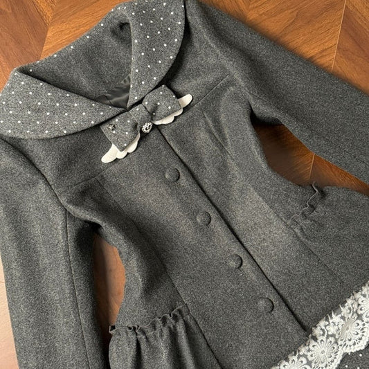 Gray Kei Polka Wool Coat Decor Bow Wing Dot Jirai Collar with