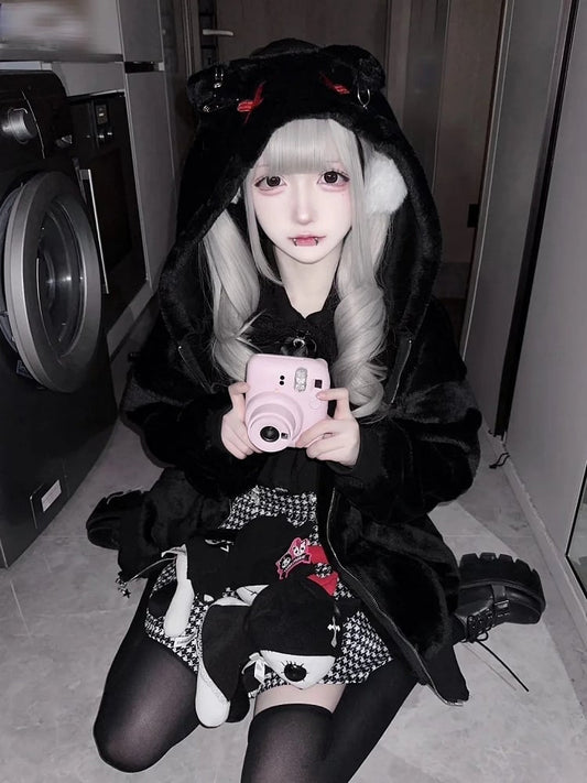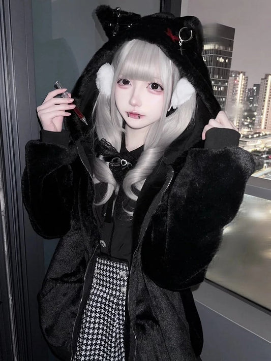 Regular Version Decor Safety Black Fleece Kei Jirai Kitty Coat Pin Ear Hooded
