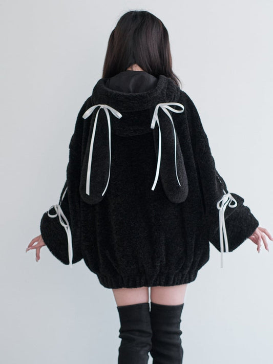 Hooded Black Fleece Ear Decor Buckle Leather Kei Bunny Coat Bow Jirai