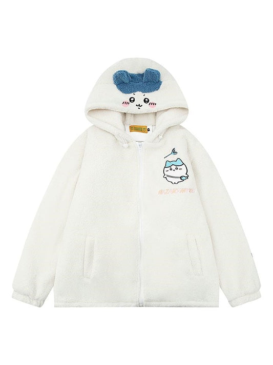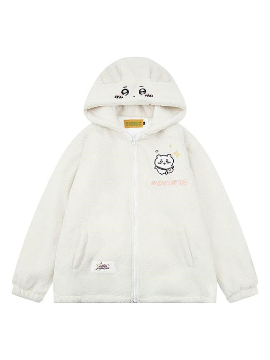 Fleece Cartoon White Hamster Coat Ears Hooded Print With