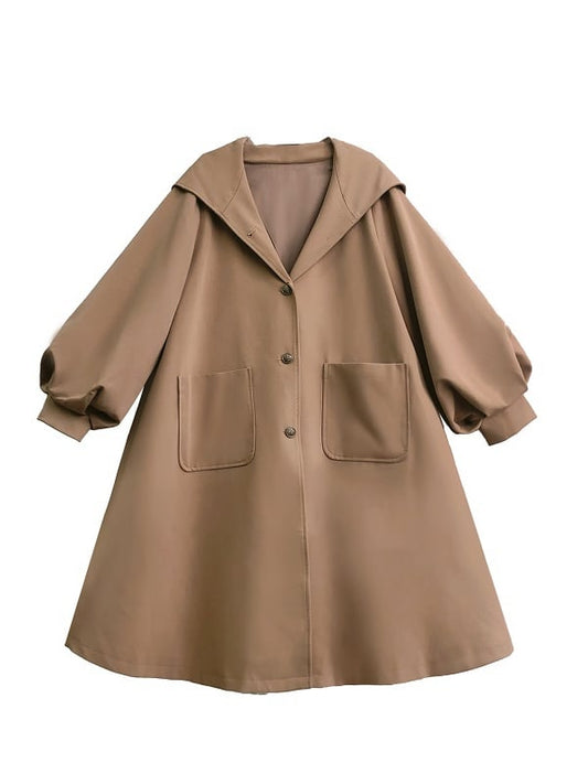 Balloon Sleeves Khaki Coat Long Hooded Preppy