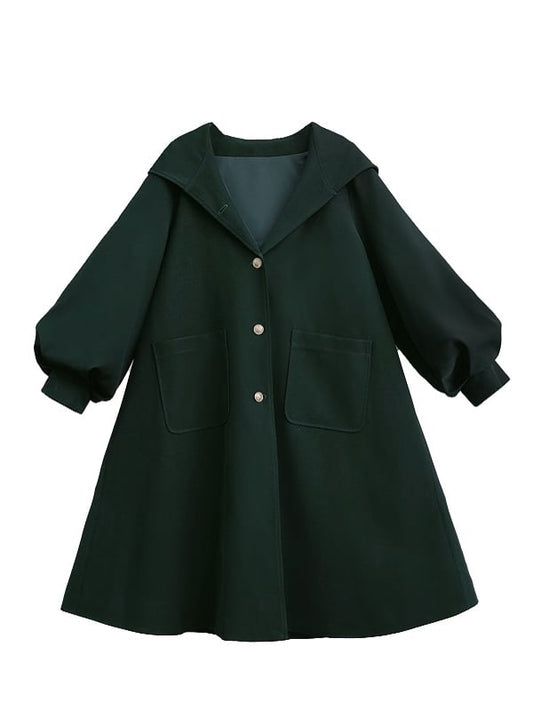 Green Preppy Hooded Balloon Sleeves Dark Long Coat