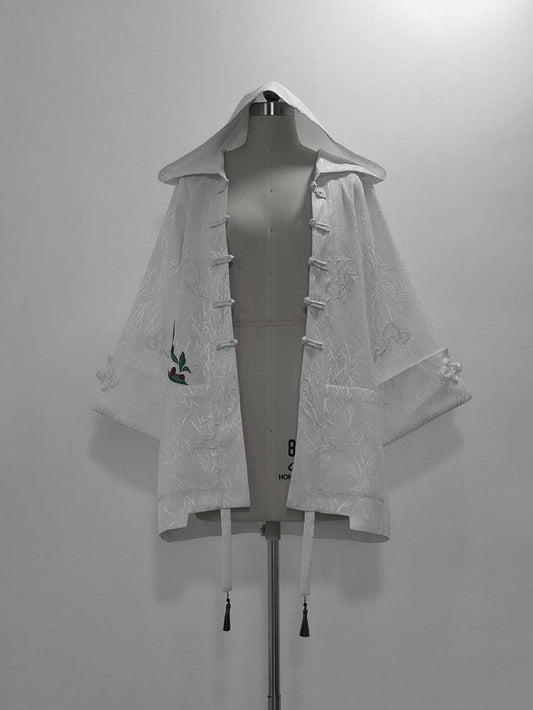 White Jacquard Leaf Hooded Coat Bamboo
