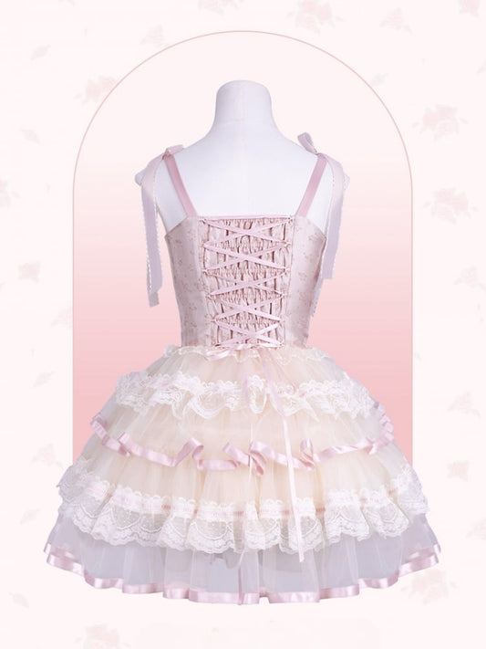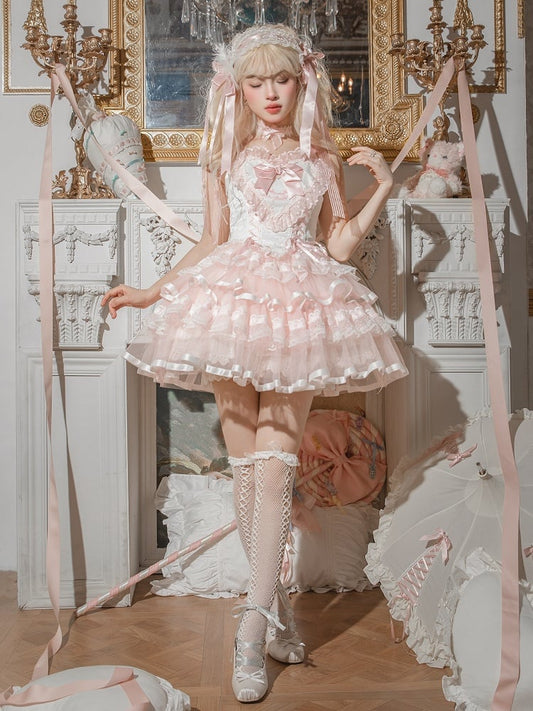 Pink Balletcore Lace Trim Heart Bodice Princess Lolita Corset Jumper Skirt