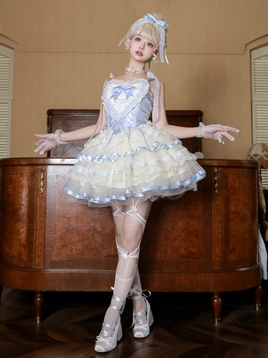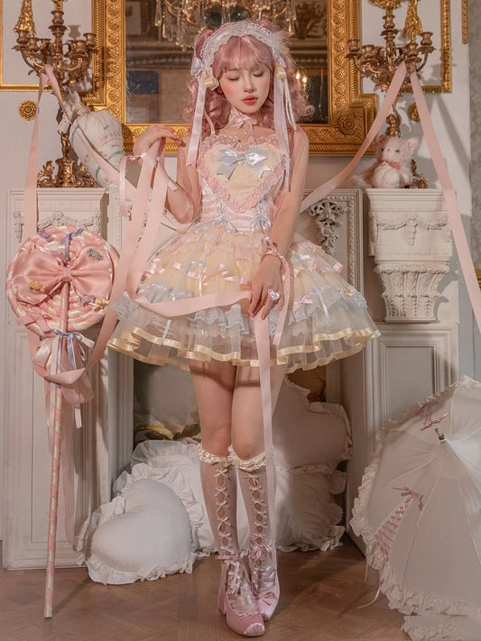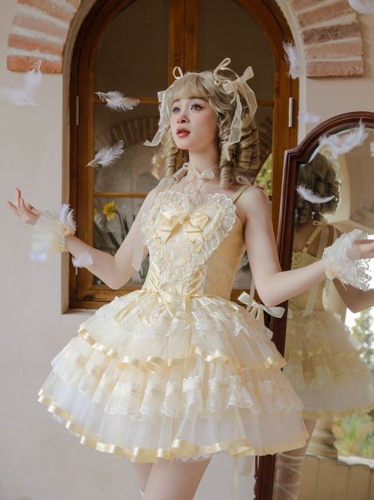Yellow Lace Trim Heart Bodice Balletcore Princess Lolita Corset Jumper Skirt