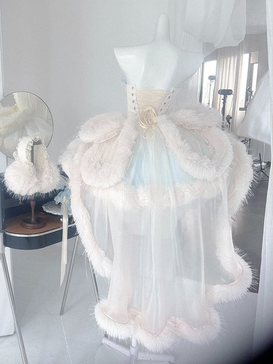 Blue and White Porcelain Strapless Corset Dress + Plush Trimming Hooded Cape
