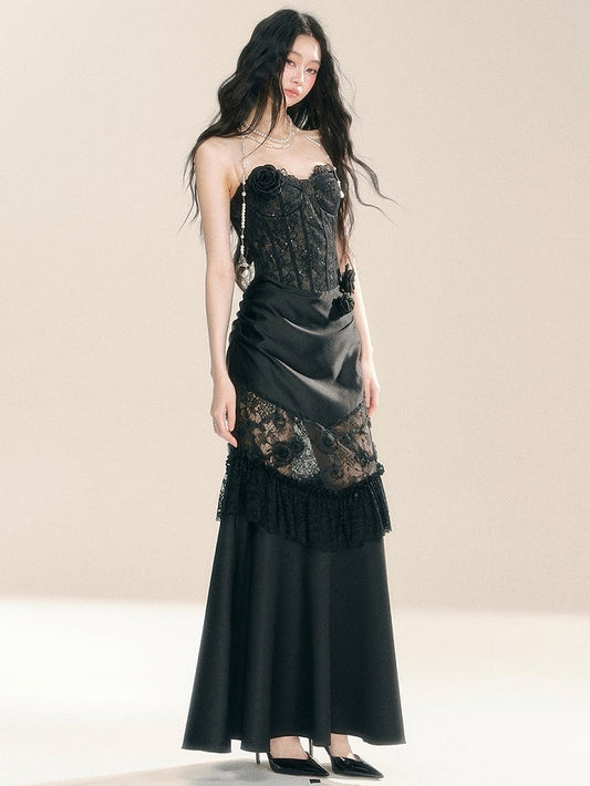 Black Floral Lace Corset Bodice Patchwork Dress Evening Gown