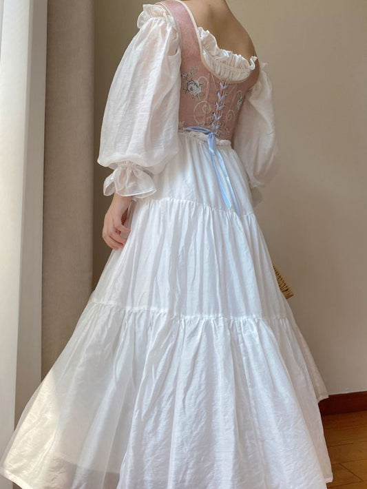 Light Pink Puff Sleeves Corset Vintage Dress and Panier Set