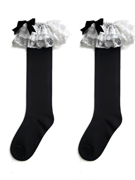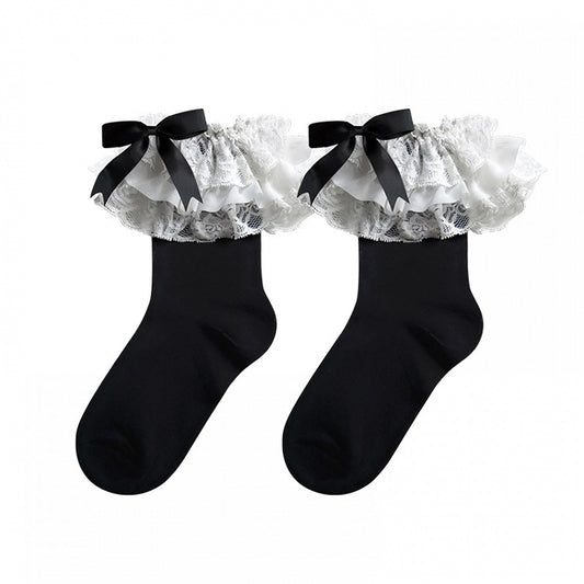 Decorated Lolita Multi-Layer Calf White/Black Bow Trim Lace Socks