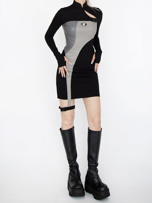 Cyberpunk Futuristic Black & Gray Banded Collar Cutout Detail Glamorous Dress with Garter
