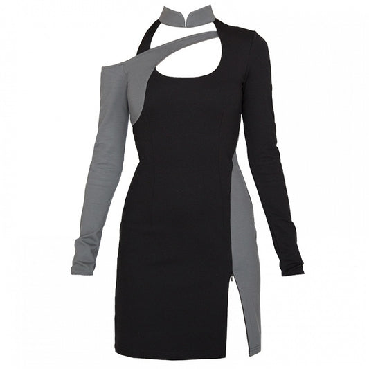 Cyberpunk Black & Grey Banded Collar Cutout Detail Side Slit Glamorous Dress